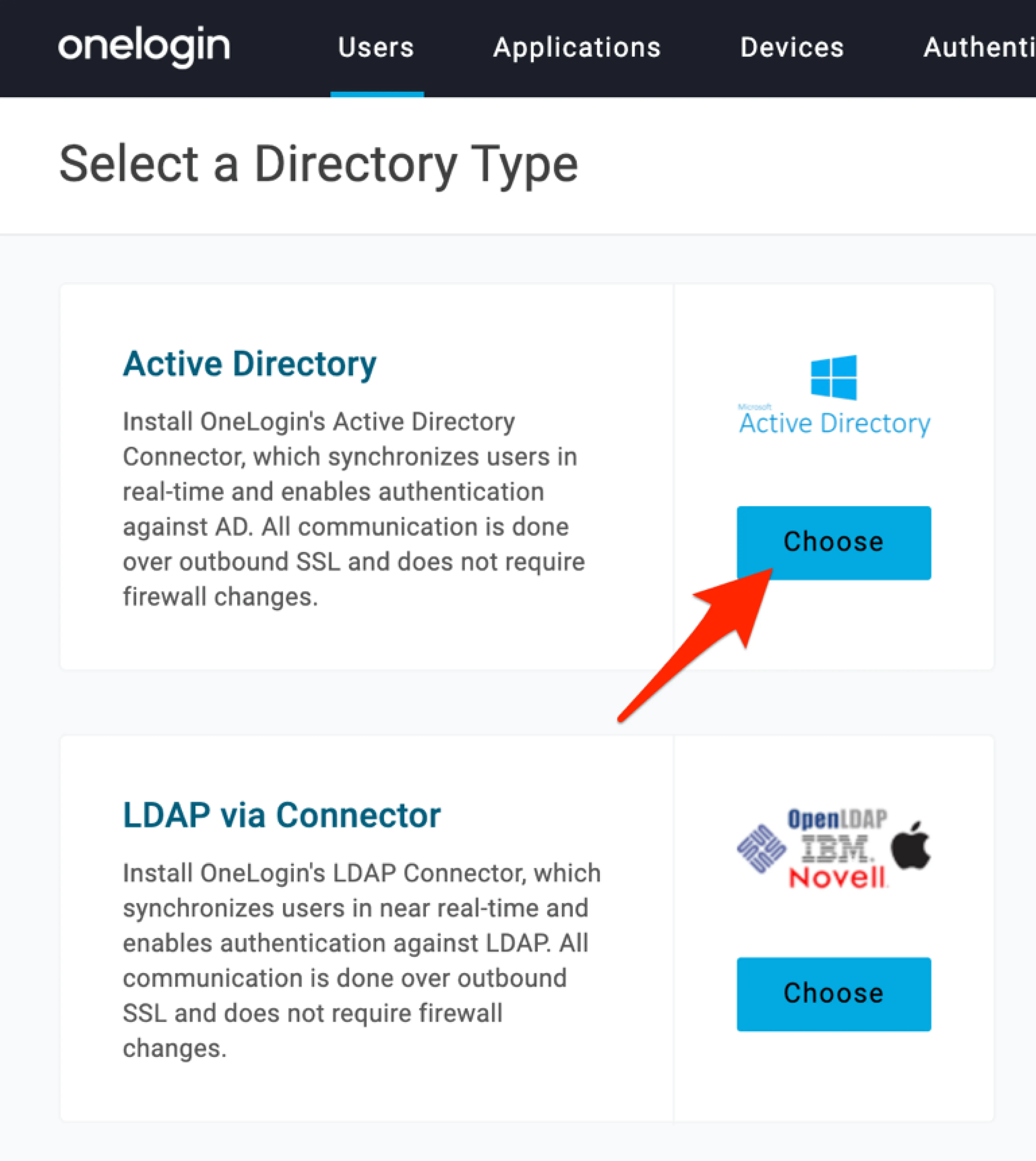 リモートデスクトップなどを利用して、Windows Serverにドメイン管理者権限を持つアカウントでログインします。 ブラウザを開き、OneLoginにログインしたら、管理者メニューから Users > Directories を開きます。