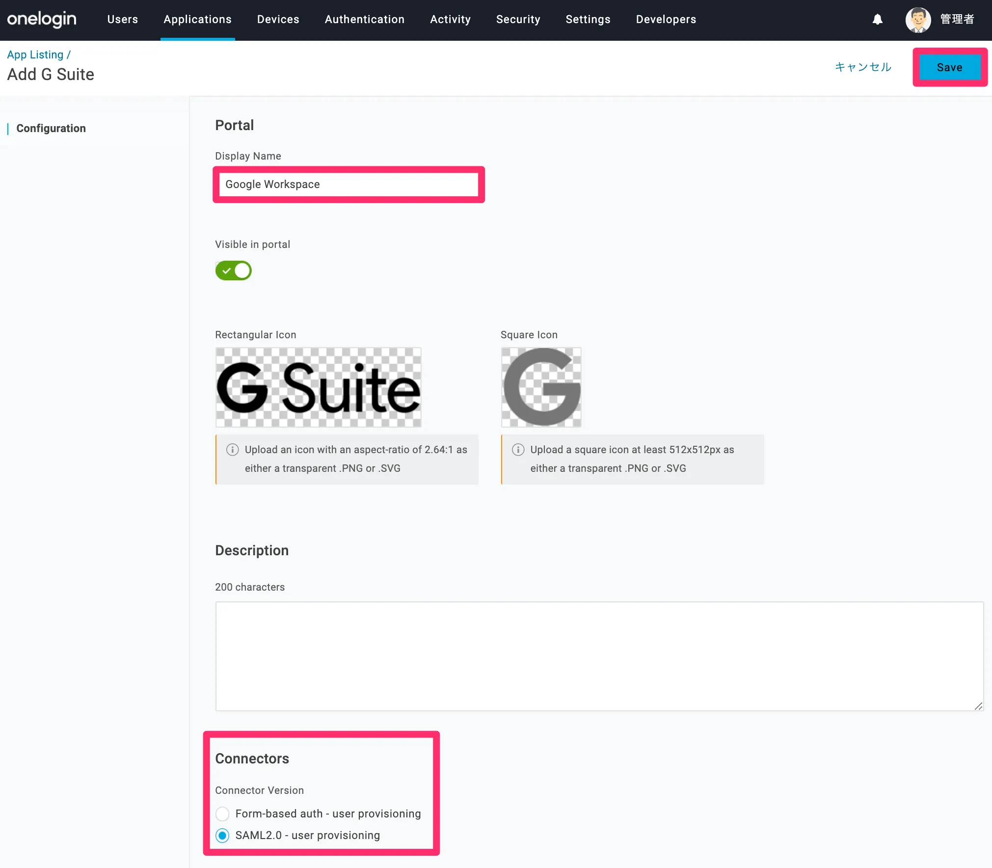 Add G Suite ページの Display Name で、OneLoginポータルでの表示名を設定します 例:Google Workspace 次に、Connectors > Connector Version > SAML2.0 - user provisioning をチェックしてから[Save]をクリックしてアプリを追加します