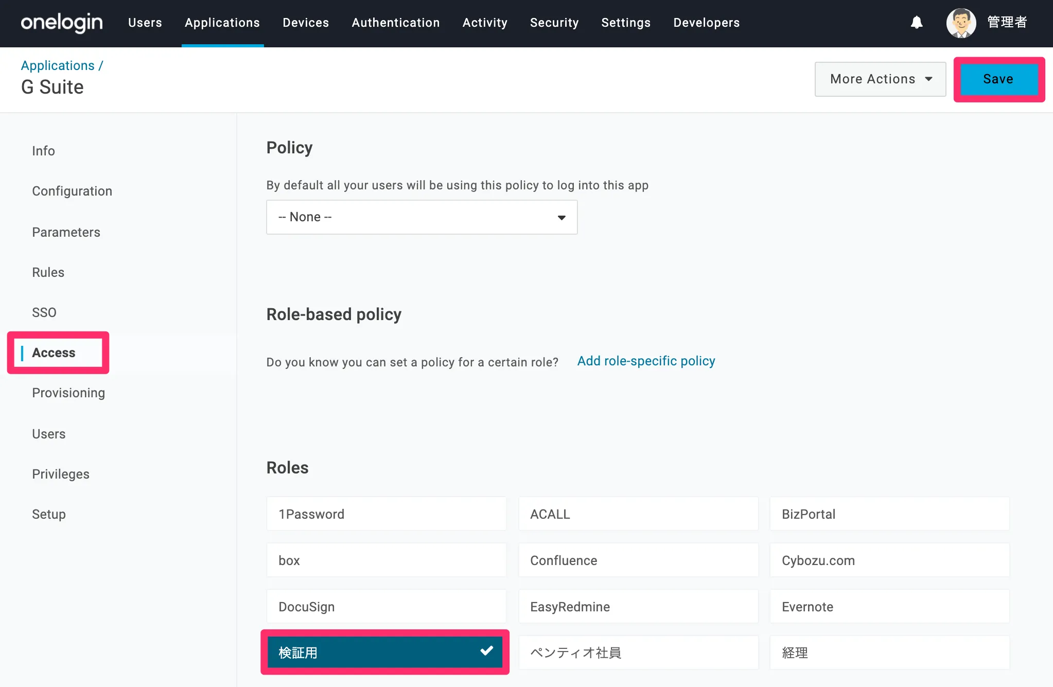 Access > RolesでGoogle Workspaceを割り当てるロールを選択し、[Save]します *現在、OneLoginにログインしている管理者アカウントがロールに含まれていることを確認してください