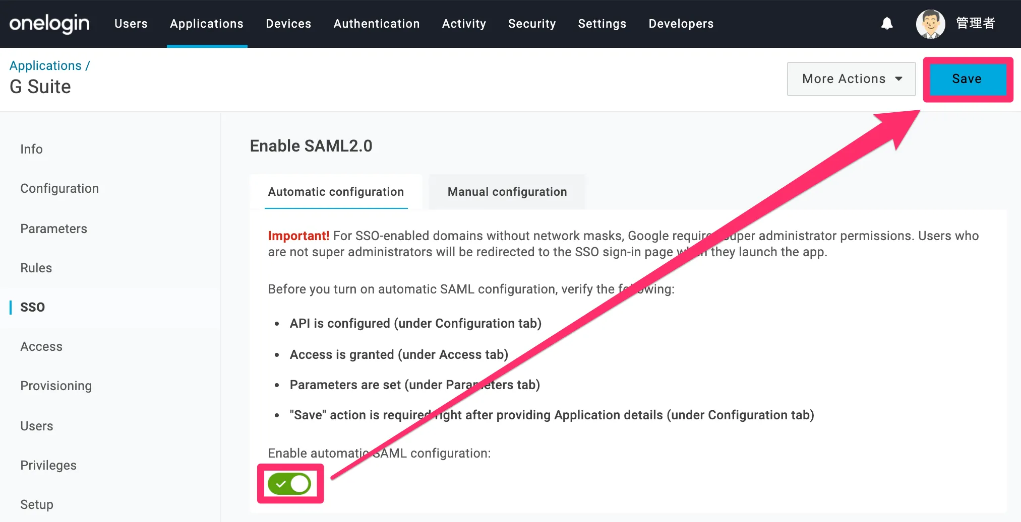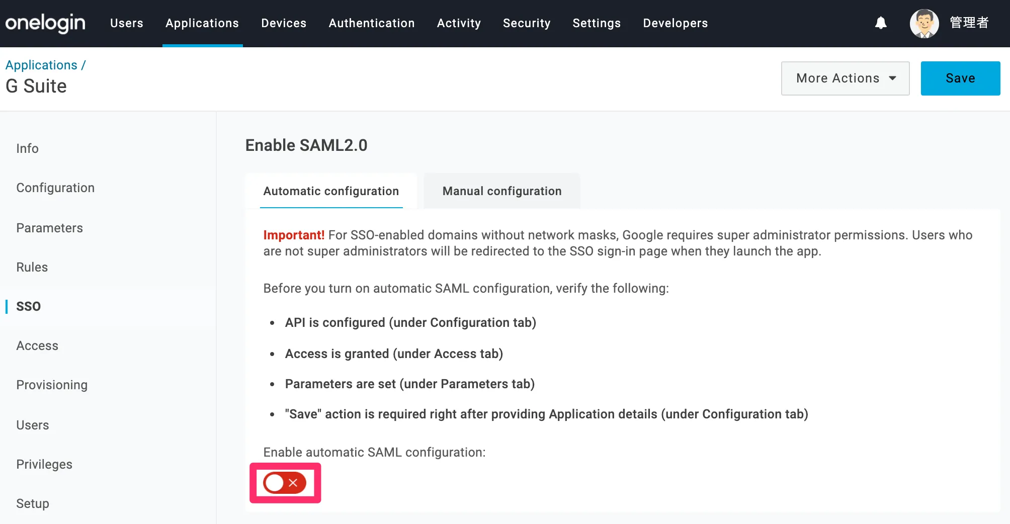 SSO > Automatic Configuration > Enable automatic SAML configuration: のトグルをクリックします ※説明に書かれている下記の4項目が満たされているとトグルが有効になります