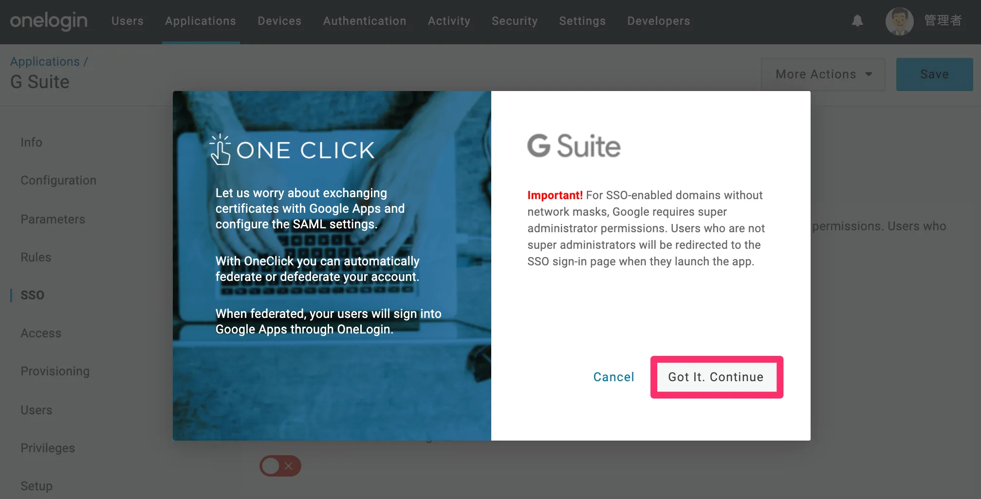 *G Suiteは2020年10月にGoogle Workspaceに改称されました。OneLogin管理画面での表記は依然G Suiteです。