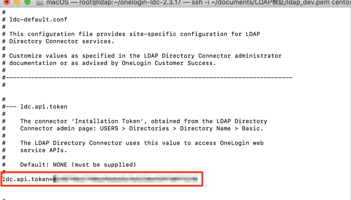 ダウンロードしたコネクタの zip ファイルを LDAP サーバーへ転送、展開します。正常に展開されると、「onelogin-ldc-[version]」というディレクトリが出現するので設定ファイル(ldc.conf)の ldc.api.token パラメーターに先ほどコピーした Installation Token を入力します。