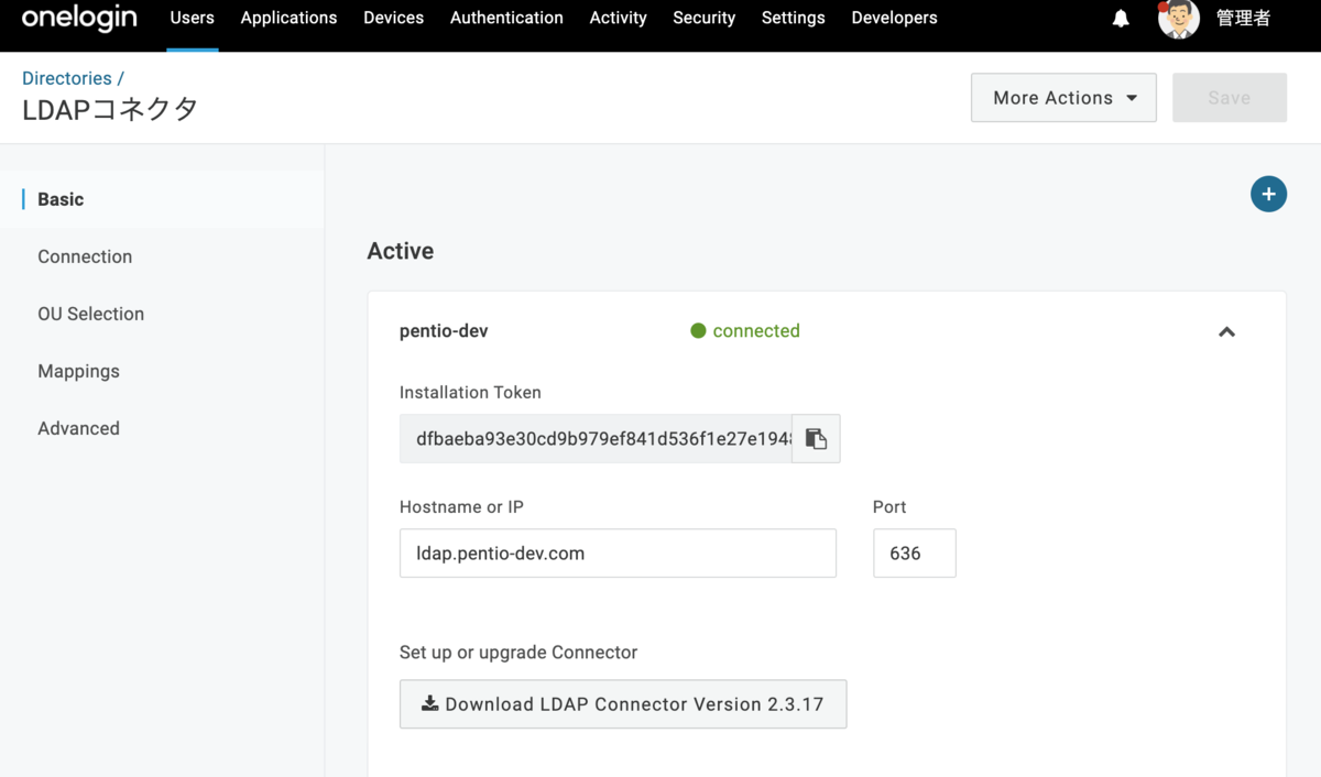 コネクタを起動できたら再び OneLogin サイトに管理者としてログインし、Users > Directory からコネクタの設定画面を開き、Connection タブから接続に必要な情報を入力していきます。