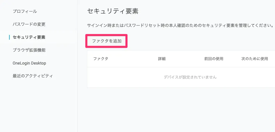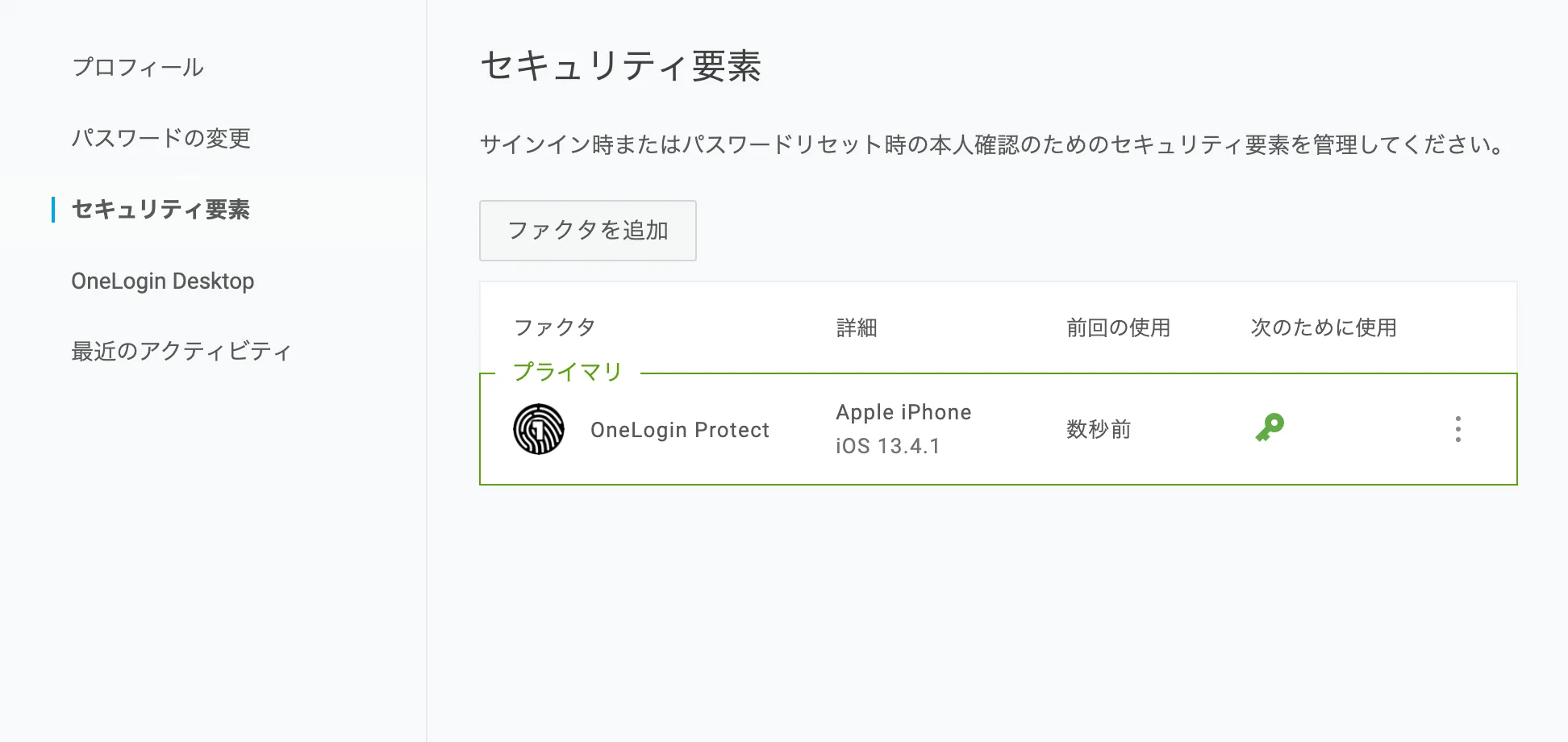 OneLogin Protectをプロフィールから設定されたい場合には、ポータル > プロフィール > セキュリティ要素 > ファクタを追加 よりOneLogin Protectを設定することが可能です 設定手順につきましては、設定手順の 4.からのものと同様になります