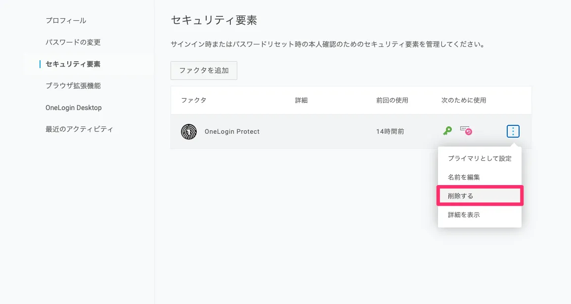 プルダウンに表示される 削除する をクリックし、OneLogin Protectを解除することができます