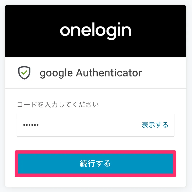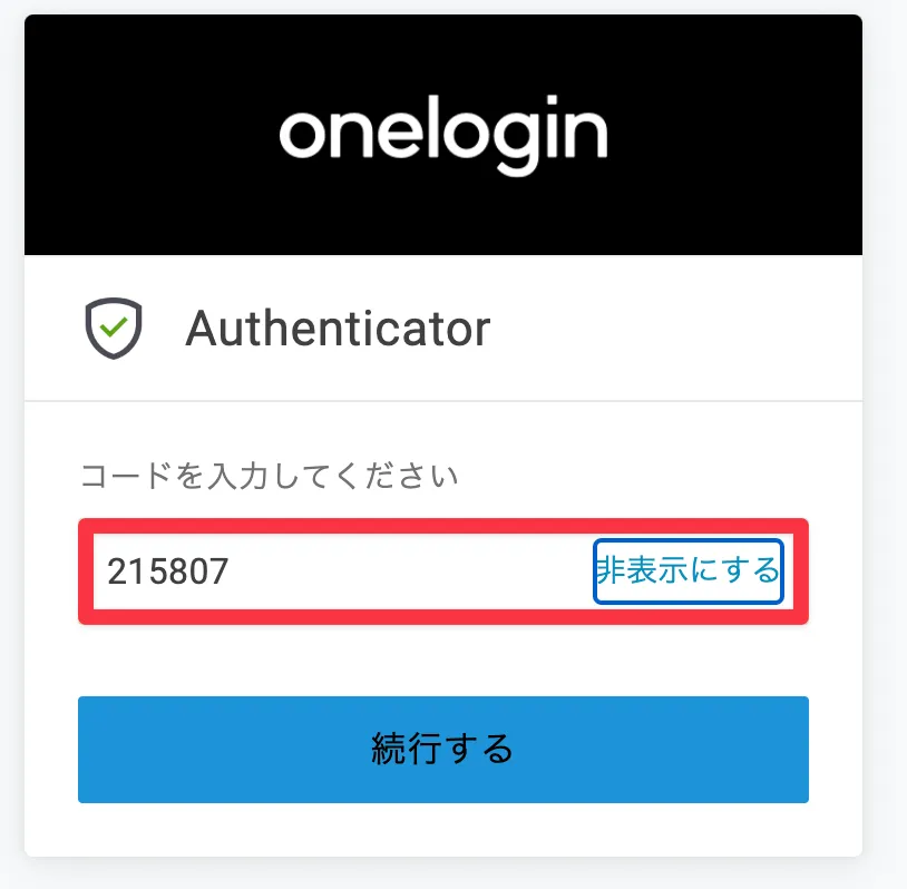 4.  Authenticatorに表示されている6桁の認証コードをOneLoginの認証画面に入力し、[続行する]をクリックします