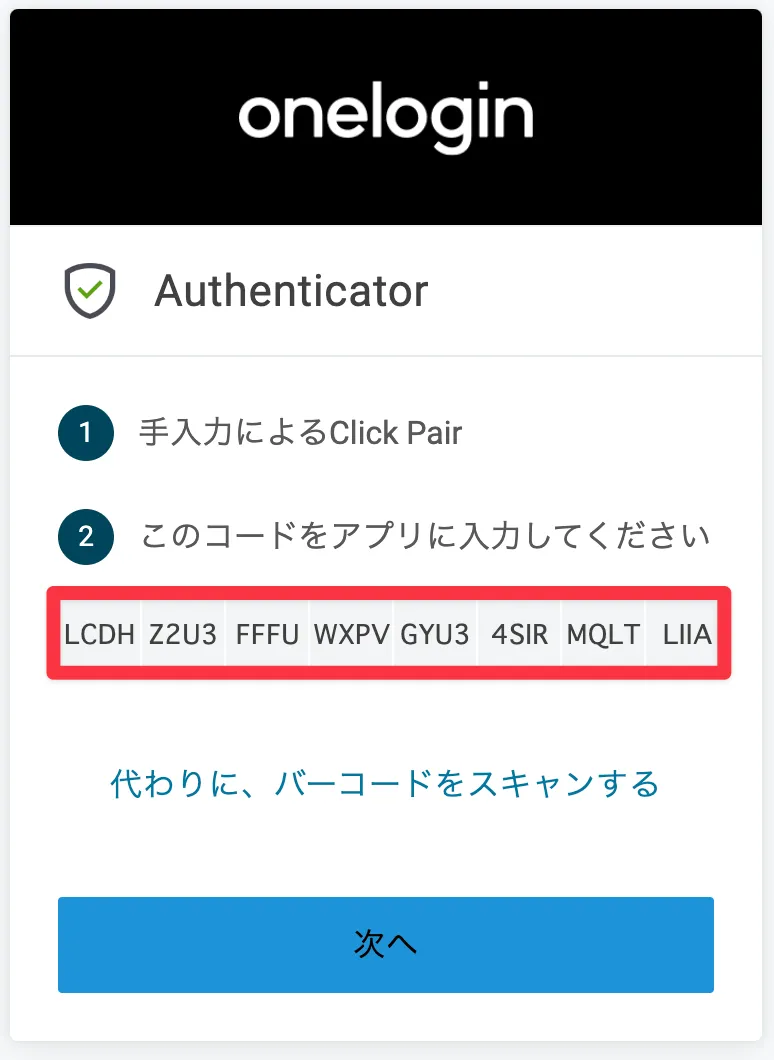 3. スマートフォンのカメラからOneLoginのQRコードを読み取ってください。読み取った後、[次へ]をクリックします
