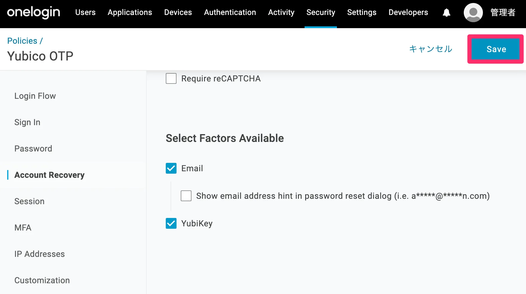 9. Select Factors Availableで「YubiKey」にチェックを入れることでユーザーがパスワードリセットをするときにもYubico OTPが使えます。