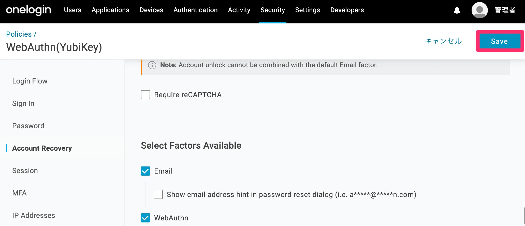 9. Select Factors Availableで「WebAuthn」にチェックを入れることでユーザーがパスワードリセットをするときにもYubiKeyのFIDO認証が使えます。