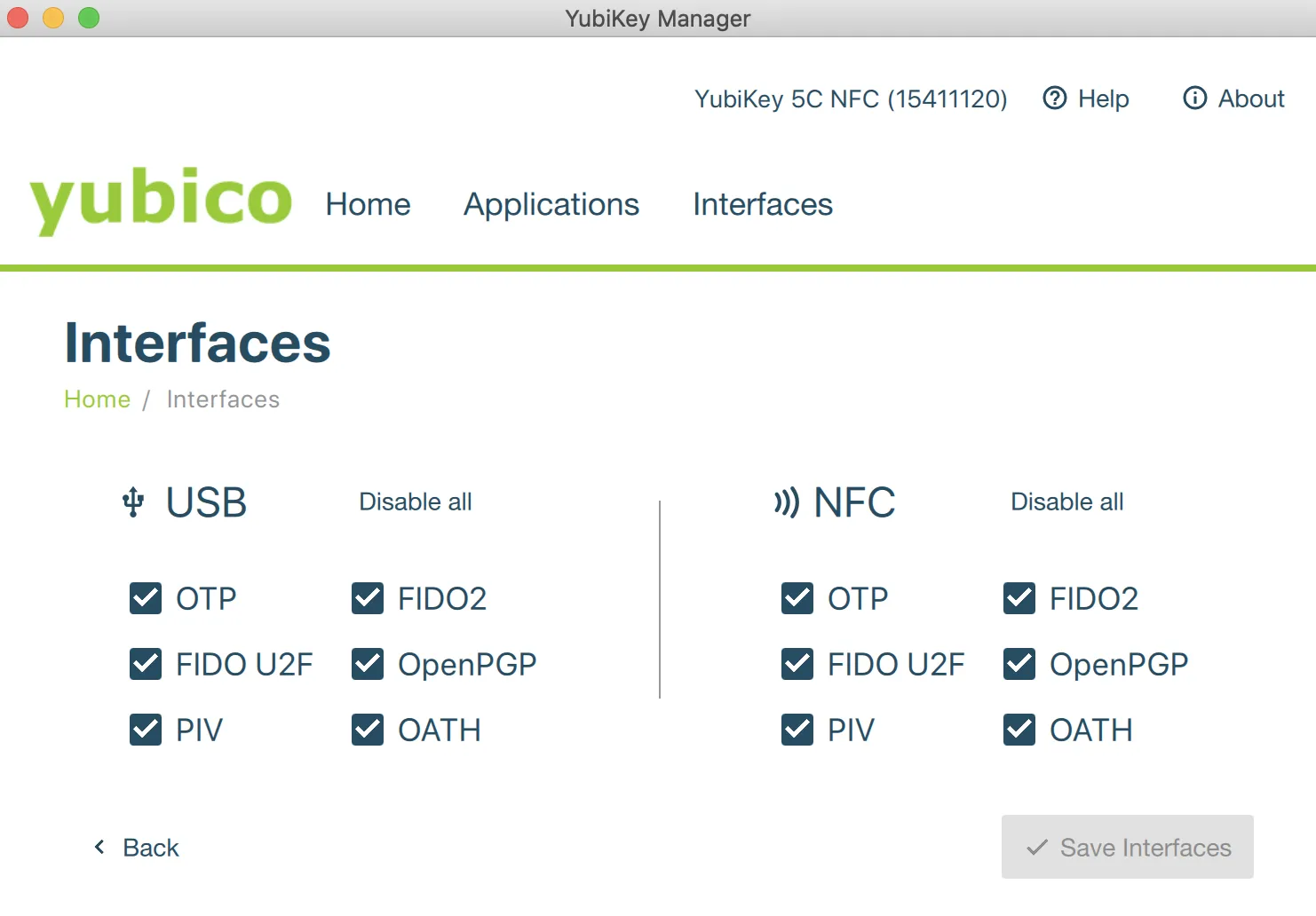 1. YubiKey Manager >> Interfacesを開き、FIDO2,FIDO U2Fを有効にします。