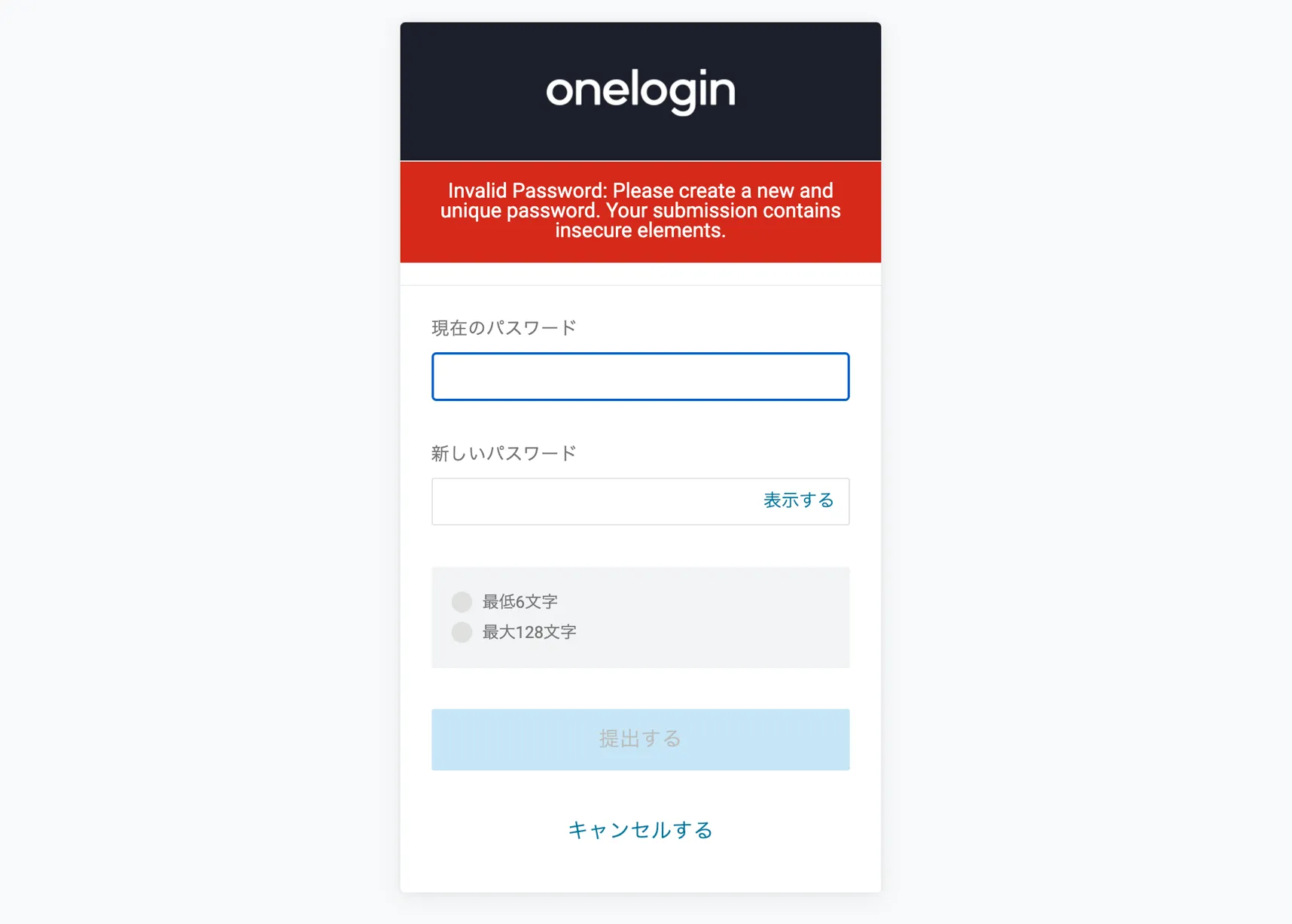 SmartCompromised Credentials Checkを設定すると、ユーザーがOneLoginのパスワードを設定する時に侵害されたパスワードを利用できなくします。 パスワードの最小長や複雑さといった従来のパスワード要件に加えて、過去に漏洩したパスワードを禁止することで、より安全なパスワードが設定できます。 危険なパスワードを設定できなくすることでOneLoginだけでなくSSO先のクラウドアプリケーションもより安全に利用できます。