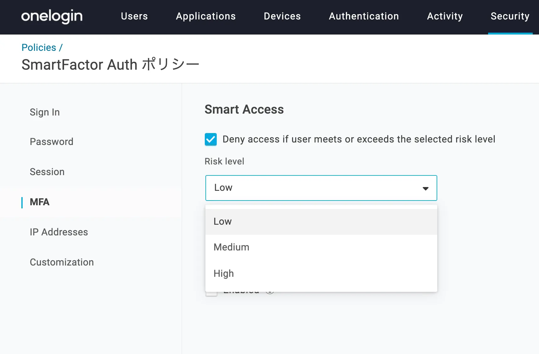 Smart Accessを有効にするとリスクスコアが設定したリスクレベルを超えたときにログインを拒否することができます。Smart Accessを設定することで、例えば海外支店のない企業における海外からのログインといった不審なアクセスを拒否します。必要なときにMFAを要求するSmart MFAと組み合わせて使うことでエンドユーザーにとって快適なログインフローと強固なセキュリティを同時に実現します。