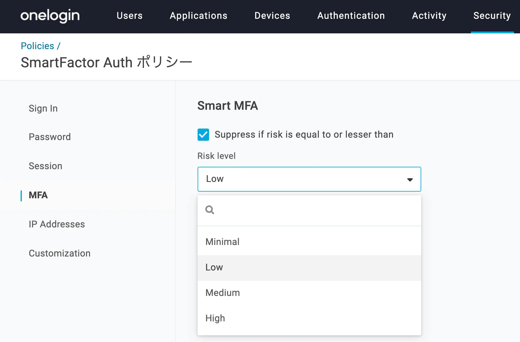 Smart MFAを有効にすると、リスクスコアが高く本人確認が必要な場合にのみユーザーにMFAを要求します。Smart MFAを適切に設定することで例えば社内IPアドレスからのアクセスや普段使用している端末からアクセスする場合にはMFAを要求されず、普段と異なるIPアドレスからのアクセス時にはMFAを要求するといった運用が可能になります。