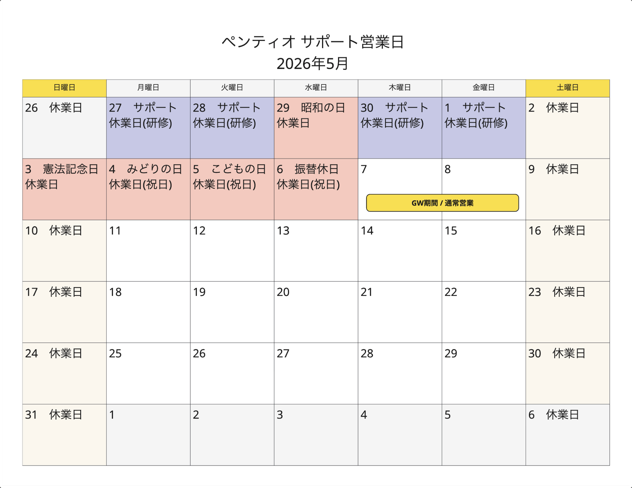 期間中に受領したお問い合わせに関しましては、製品のシステム障害等緊急のものを除き、2026年5月7日(木曜日)以降順次ご対応させていただきます。お問い合わせが集中した場合、ご回答までにお時間を要する場合がございますので、予めご了承ください。