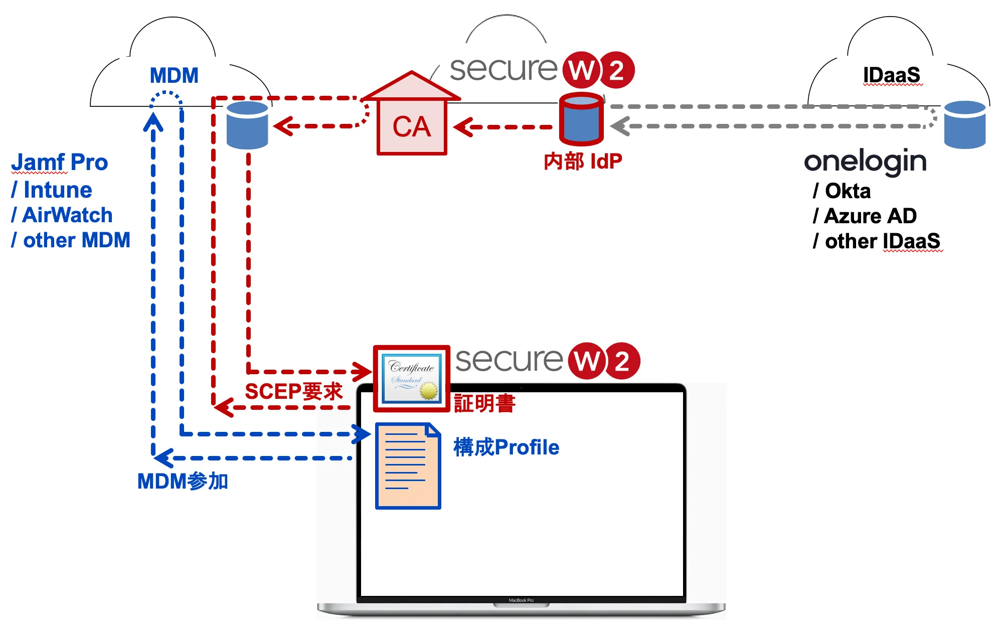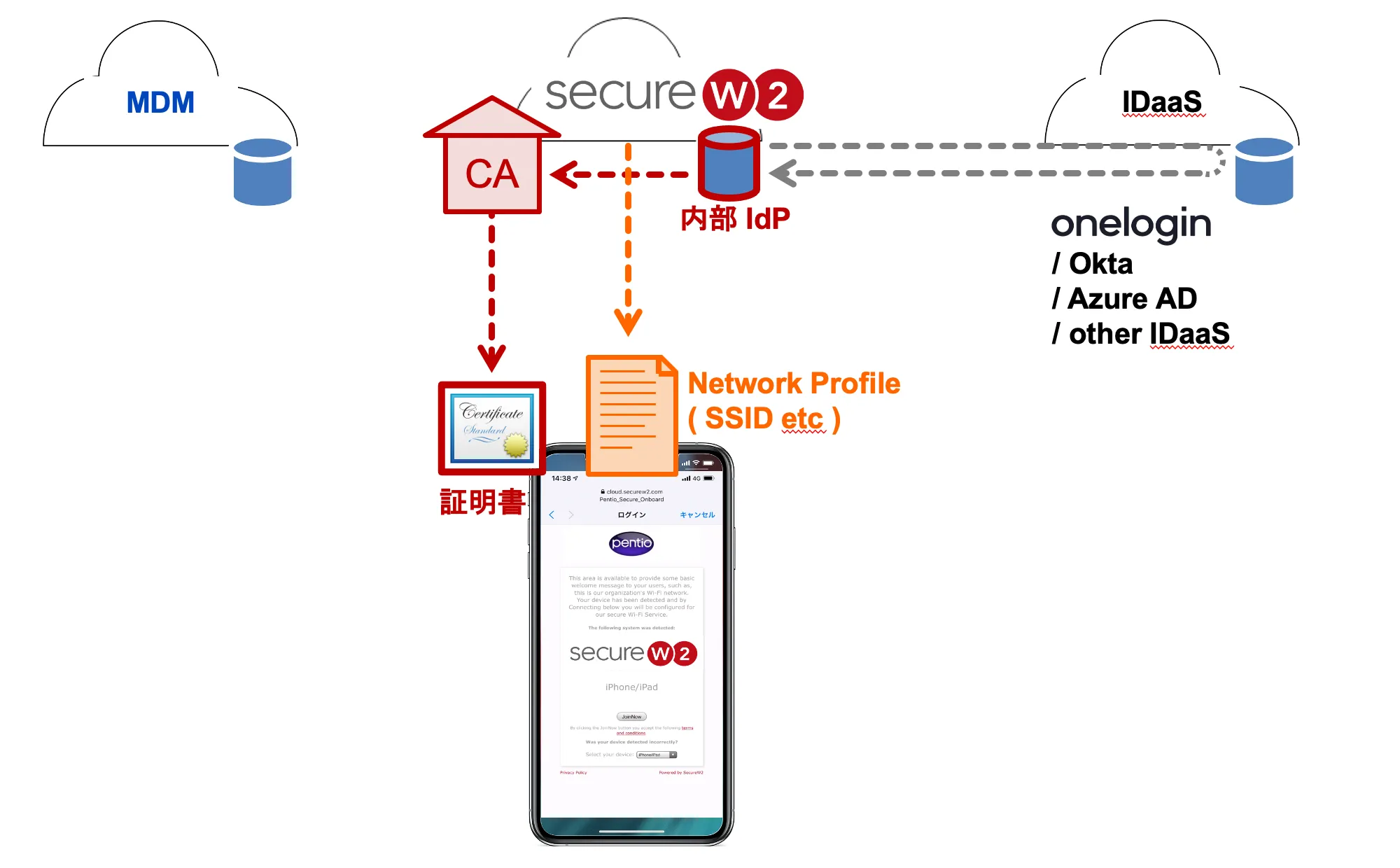 - SecureW2は証明書をMDMを通じてデバイス端末に配布する
