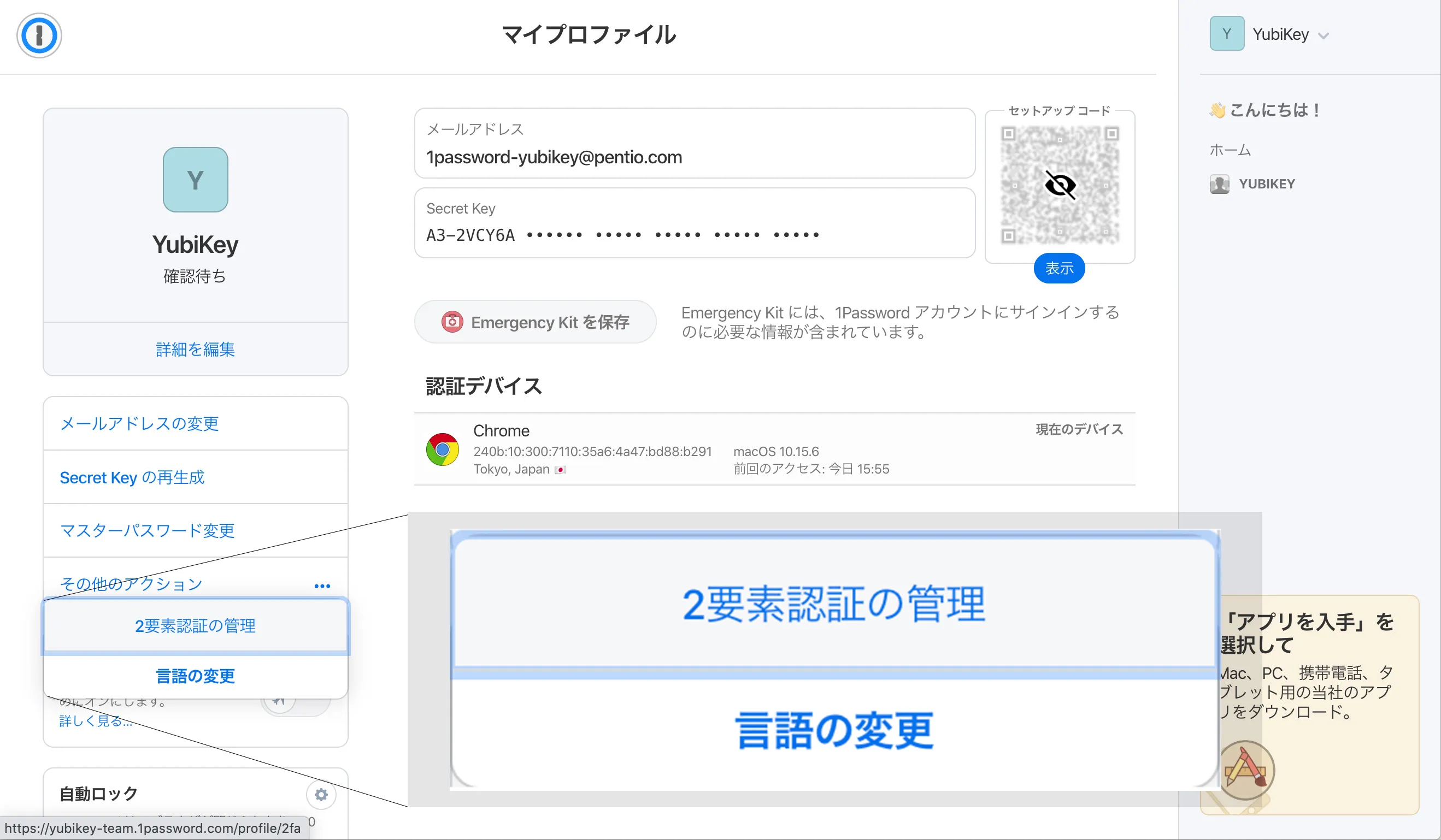 YubiKeyをFIDO2で利用サンプルとして1Passwordアカウント認証の利用方法を説明します。1PasswordではFIDO2でもFIDO U2Fでも使用できますがFIDO2を有効にした場合PINの入力が必要です。