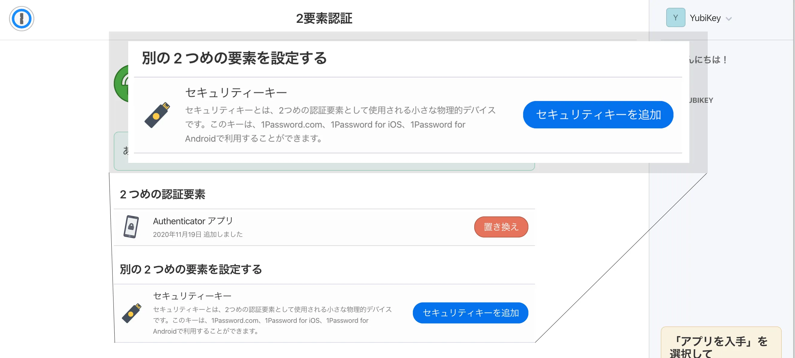 1Passwordで2要素認証にYubiKeyを登録するには、Authenticatorアプリを登録しておく必要があります - Authenticatorアプリの欄にある「アプリの設定」をクリックします