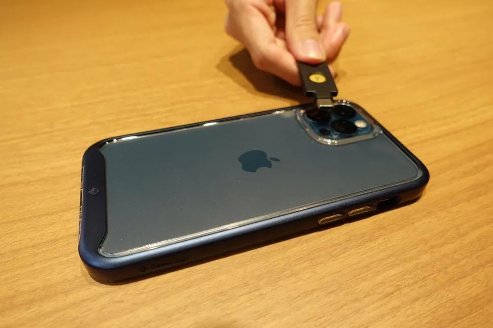 二段階認証が求められたら、下記の画像のようにYubiKeyをiPhoneに近づけることで認証ができます。