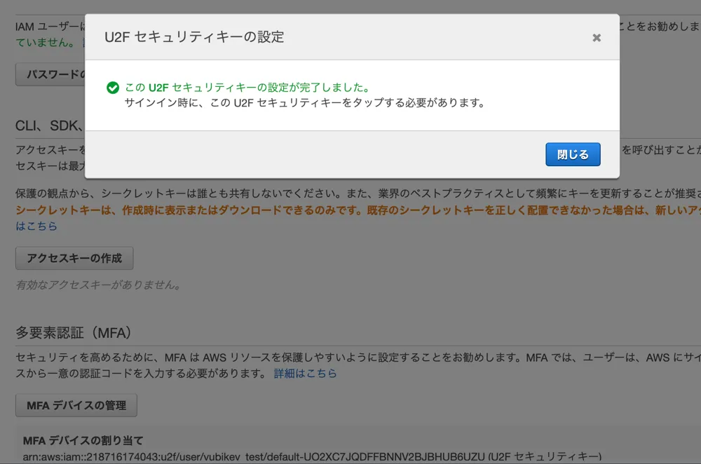以上でAWSユーザーアクセスでYubiKeyをMFAデバイスとして登録が完了です。