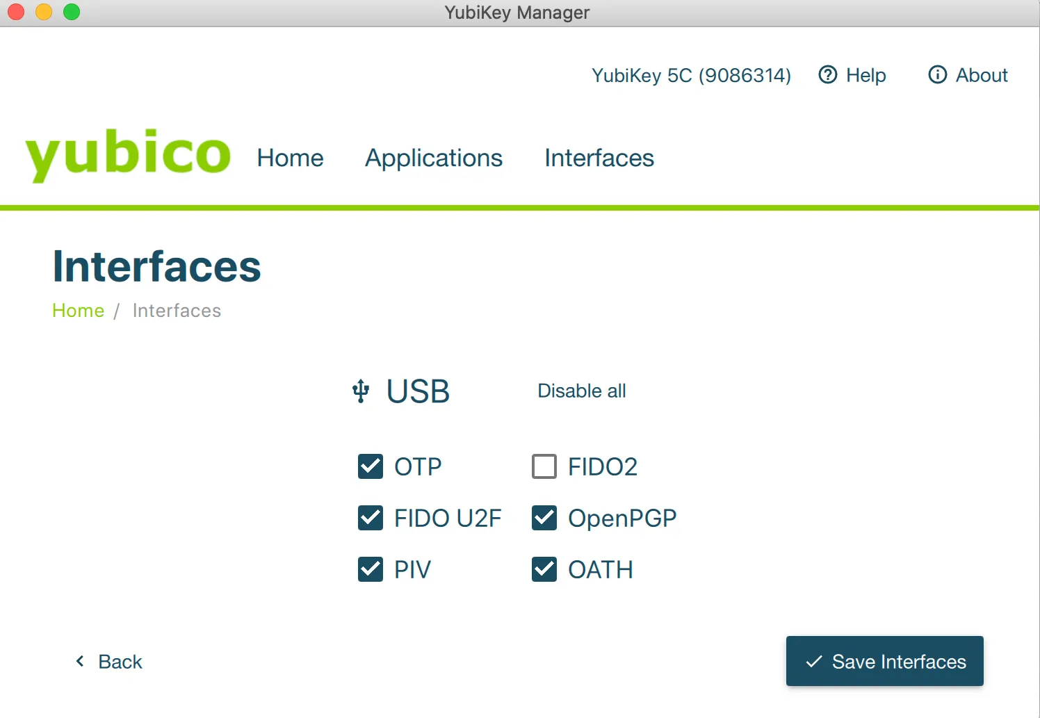 YubiKey ManagerのInterfaces設定からでFIDO2、FIDO U2Fそれぞれの有効化、無効化ができます。Default = 有効 となっています。