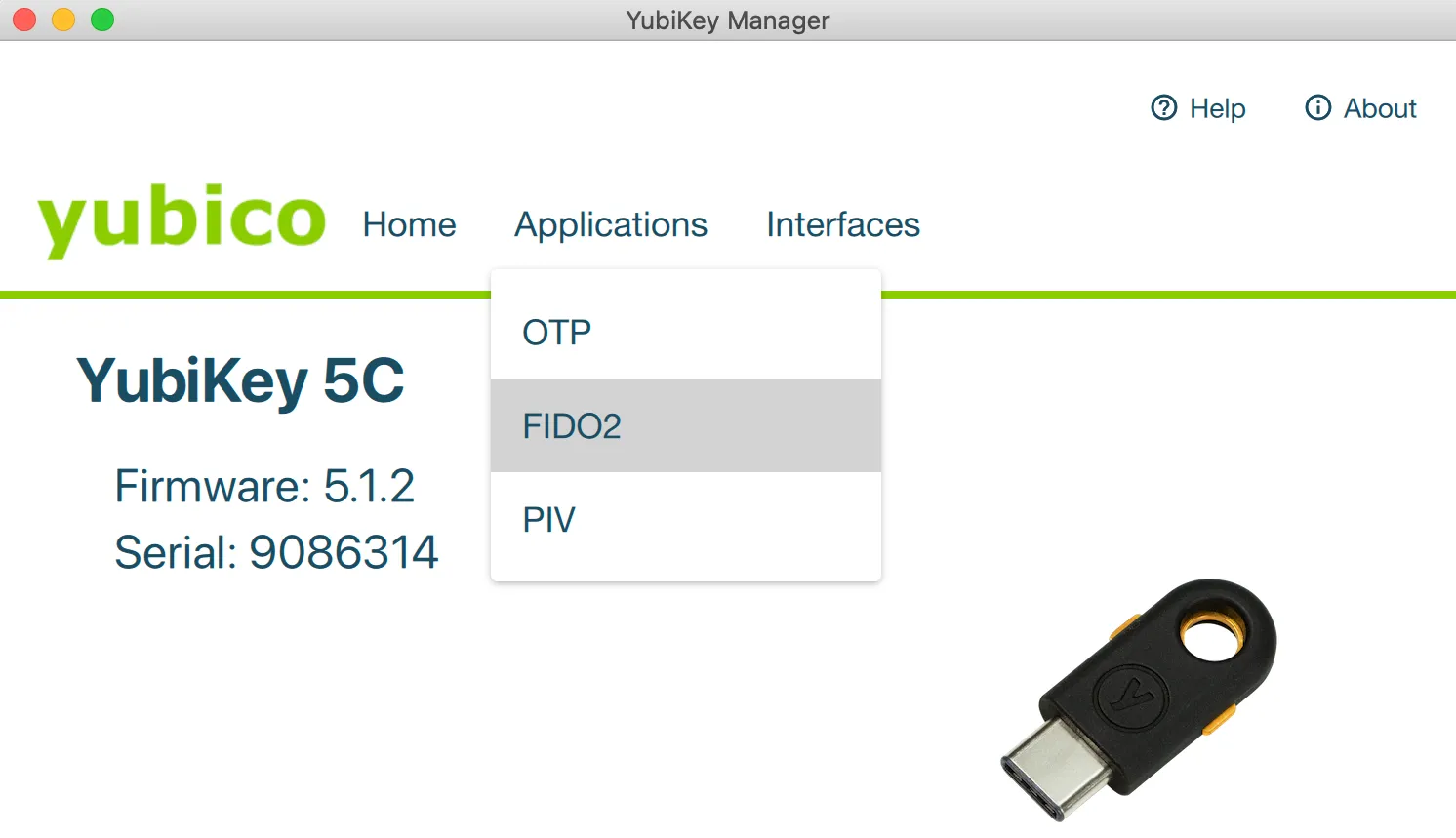 - YubiKey Managerを開き、Applications >> FIDO2を選択します