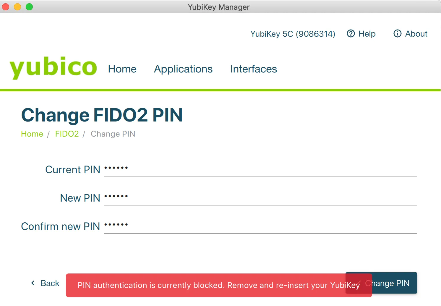 InterfaceでFIDO2を有効にしておくと、FIDO認証を使うときにPINの入力が求められるようになります。