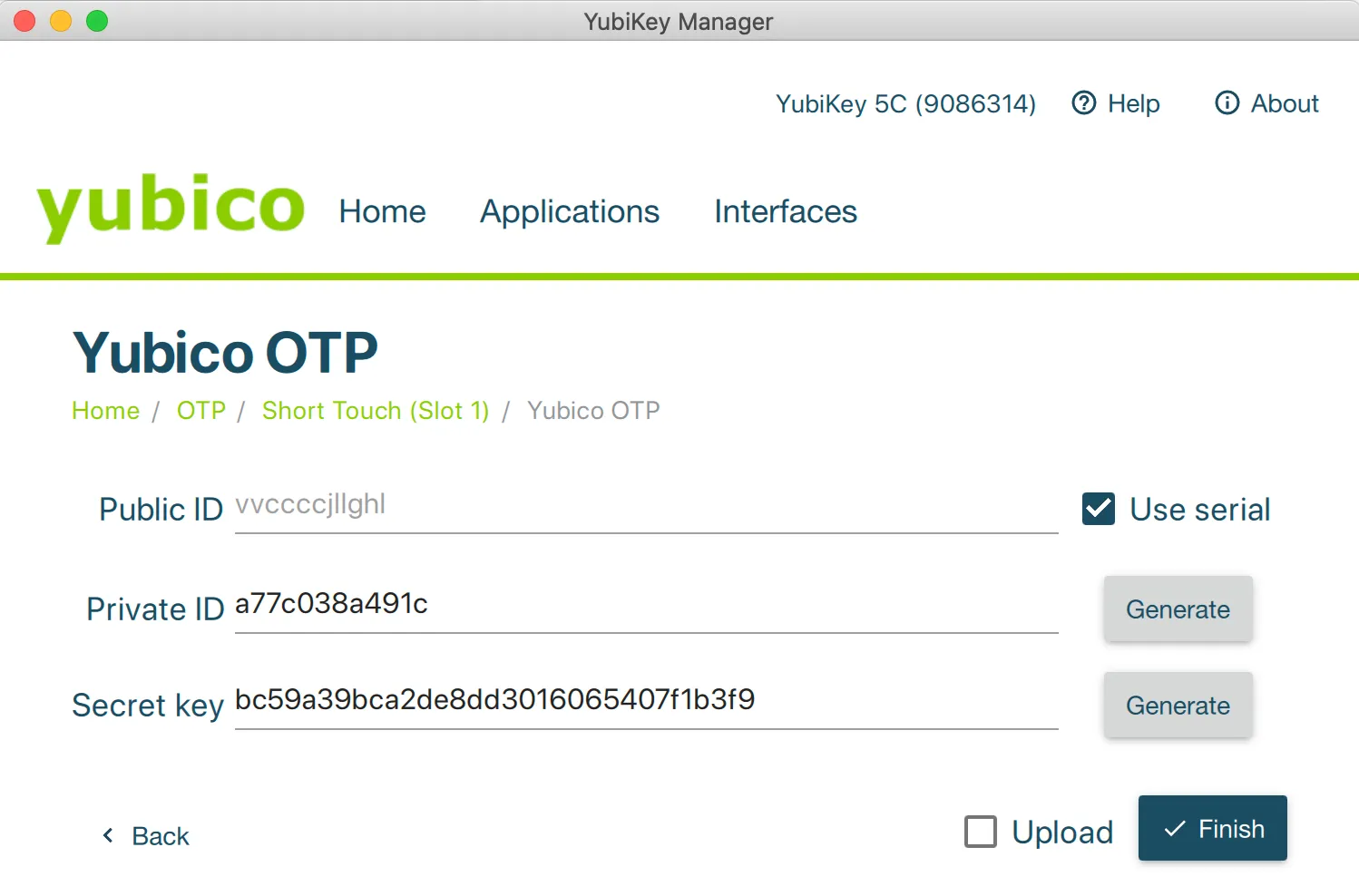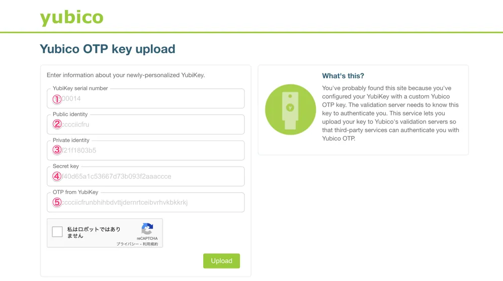 YubiKey」の欄でYubiKeyのボタンを押してOTPを出したら、「Upload」をクリックします。