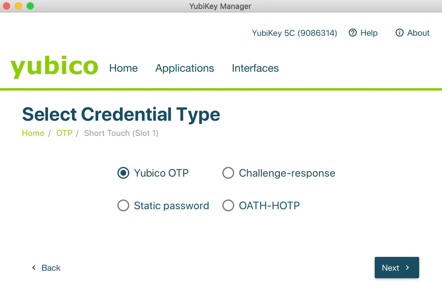 - 「Select Credential Type」で「Yubico OTP」を選択します