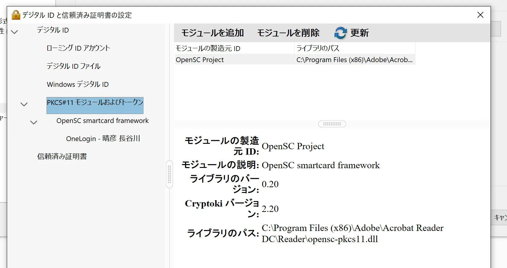 - 環境設定 > 署名(電子署名) > デジタルIDと信頼済み証明書 の設定 メニューがあり、この中にPKCS#11モジュールおよびトークン画面に [モジュールを追加]を設定する項目がありこれを開く