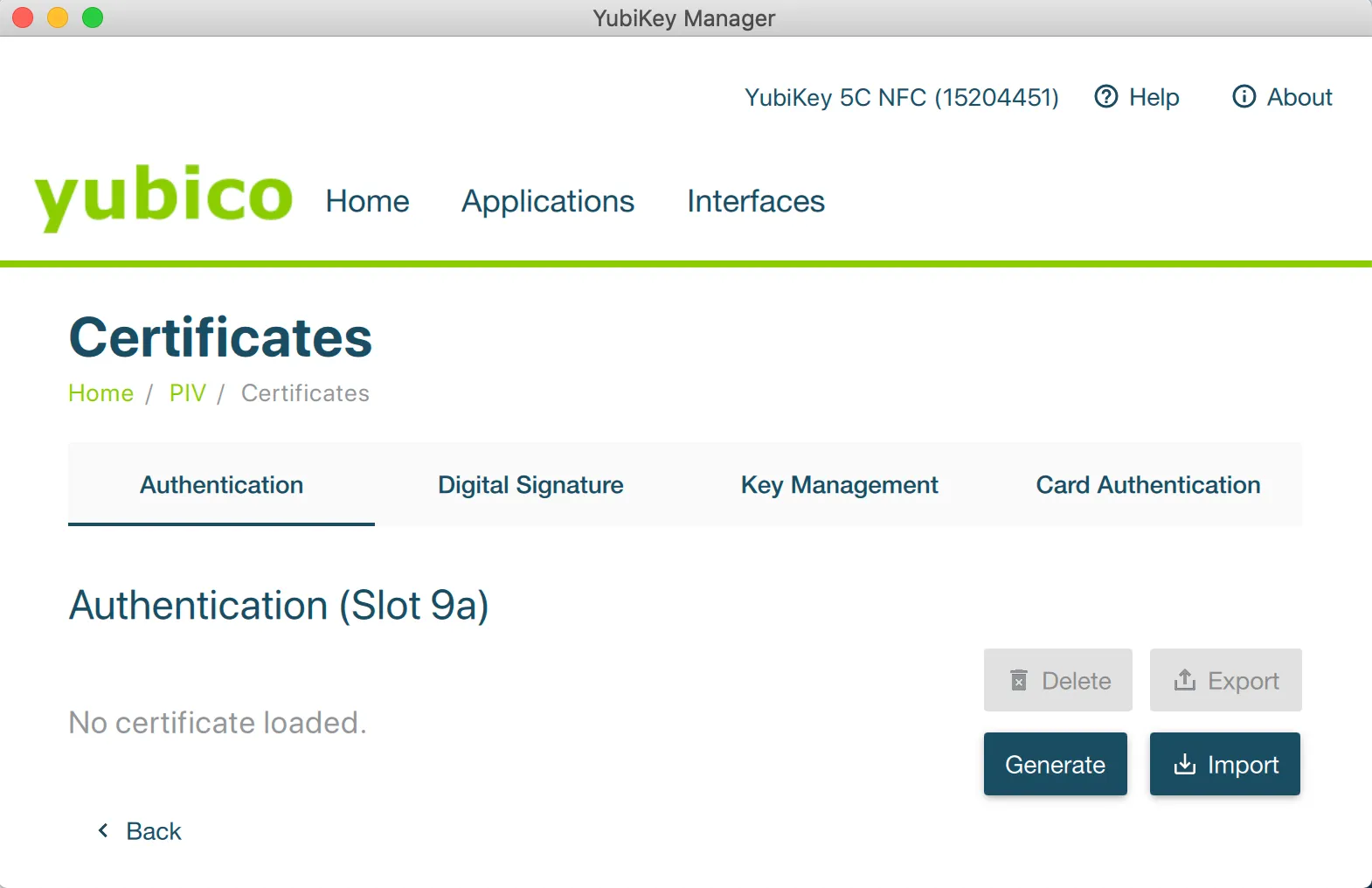 - 証明書をインポートするスロットを選択する。図はAuthentication(スロット9a)の場合を表しています。
